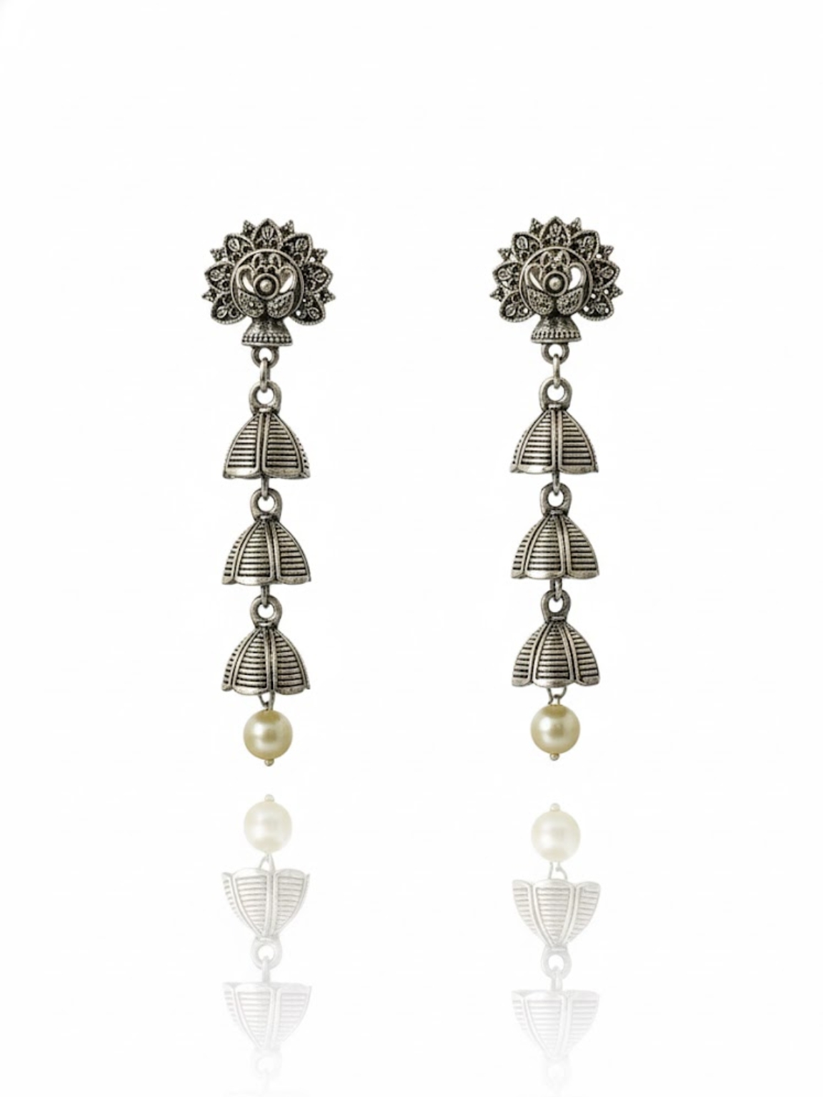 These oxidised silver earrings bring a touch of tradition with a modern layered twist. The detailed floral top adds charm, while the three dome danglers ending in a subtle bead drop create graceful movement. Perfect for ethnic outfits, festive occasions, or everyday wear with a statement edge.