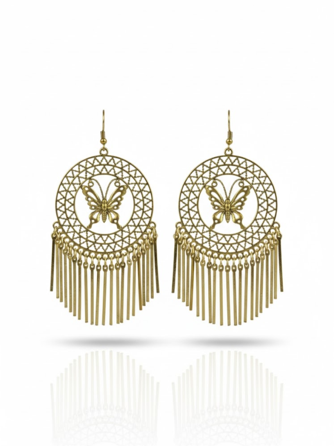 These earrings beautifully combine the delicate charm of a butterfly with the statement look of dreamcatcher-style hoops. The golden finish paired with the detailed design and hanging tassels makes them stand out as a bold yet graceful accessory. Their lightweight structure ensures comfort while maintaining a rich and stylish appearance.