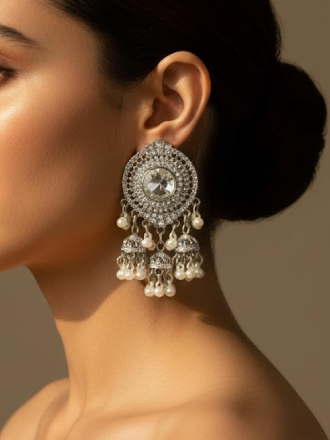 Multiple jhumka-style danglers adorned with pearl beads