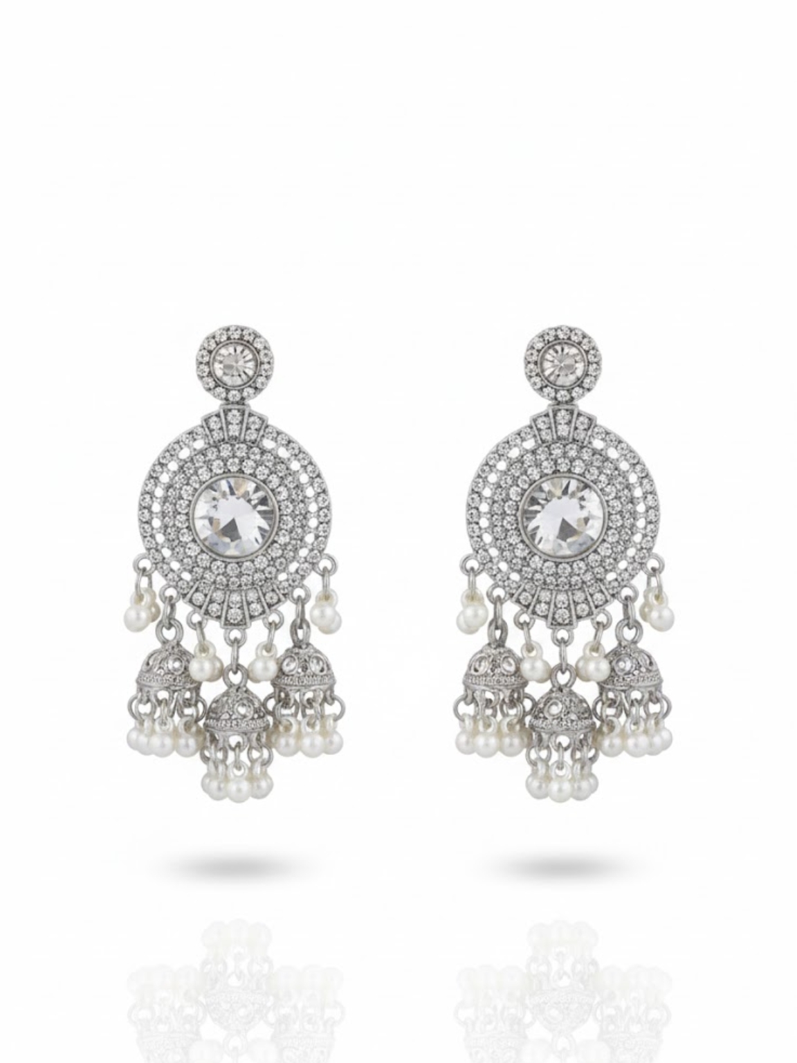 These earrings bring together the sparkle of a mirror stud with the elegance of pearl danglers. The silver-toned finish gives them a regal appeal, while the clustered jhumka-style pearls add movement and charm. Perfect for weddings, parties, and festive occasions, these earrings strike a balance between traditional aesthetics and modern style.
