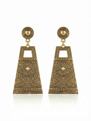 Antique Gold Geometric Dangle Earrings with Intricate Carvings